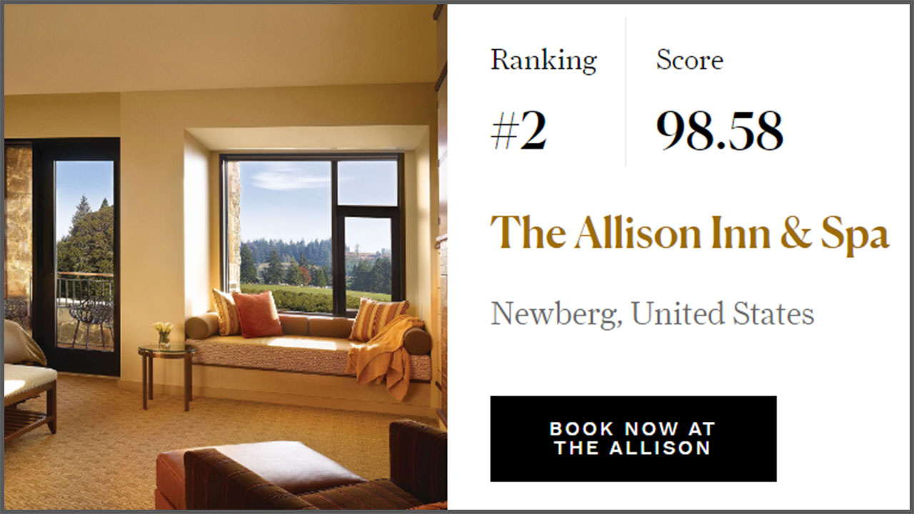 Once again, people in the know *know*… The Allison Inn & Spa achieved it’s highest ranking in 14 years of being open, and this is just the beginning! Check out the other winners, as well: https://www.cntraveler.com/gallery/pacific-northwest-top-hotels