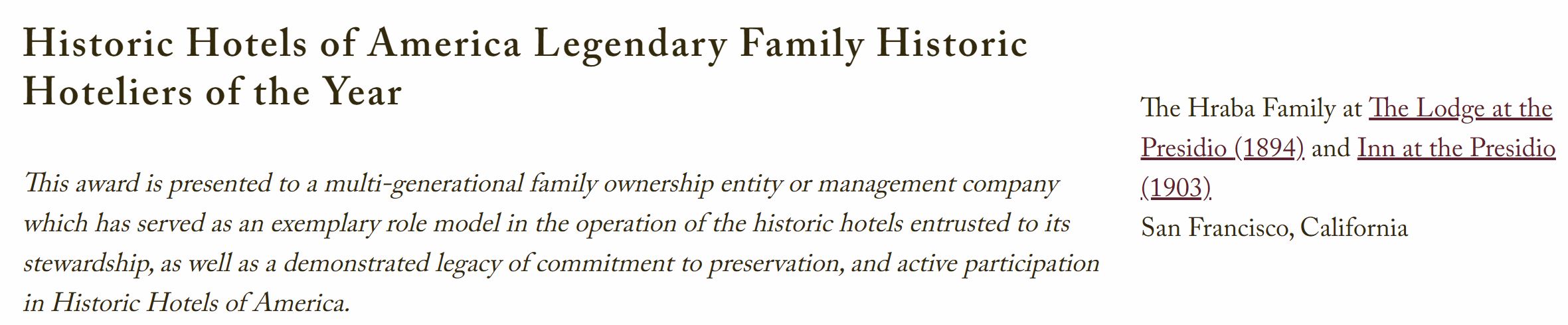 Our hotels win awards and garner accolades, but we were very proud to be voted the Historic Hotels of America “Legendary Family Historic Hoteliers of the Year” in 2022. It was an amazing honor, and we received the award with my mother-founder Pat, my partner sister Kristen, and myself, with Larry Horowitz of Historic Hotels of America.
